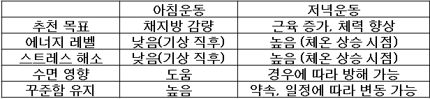 “아침 운동 vs 저녁 운동”의 차이점과 각각의 장단점을 정리해 볼게요.